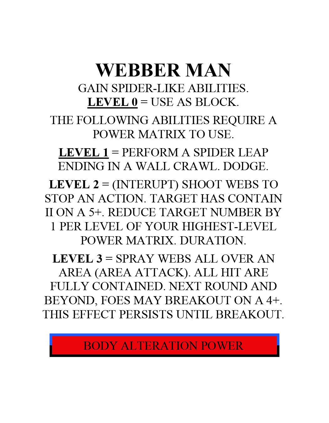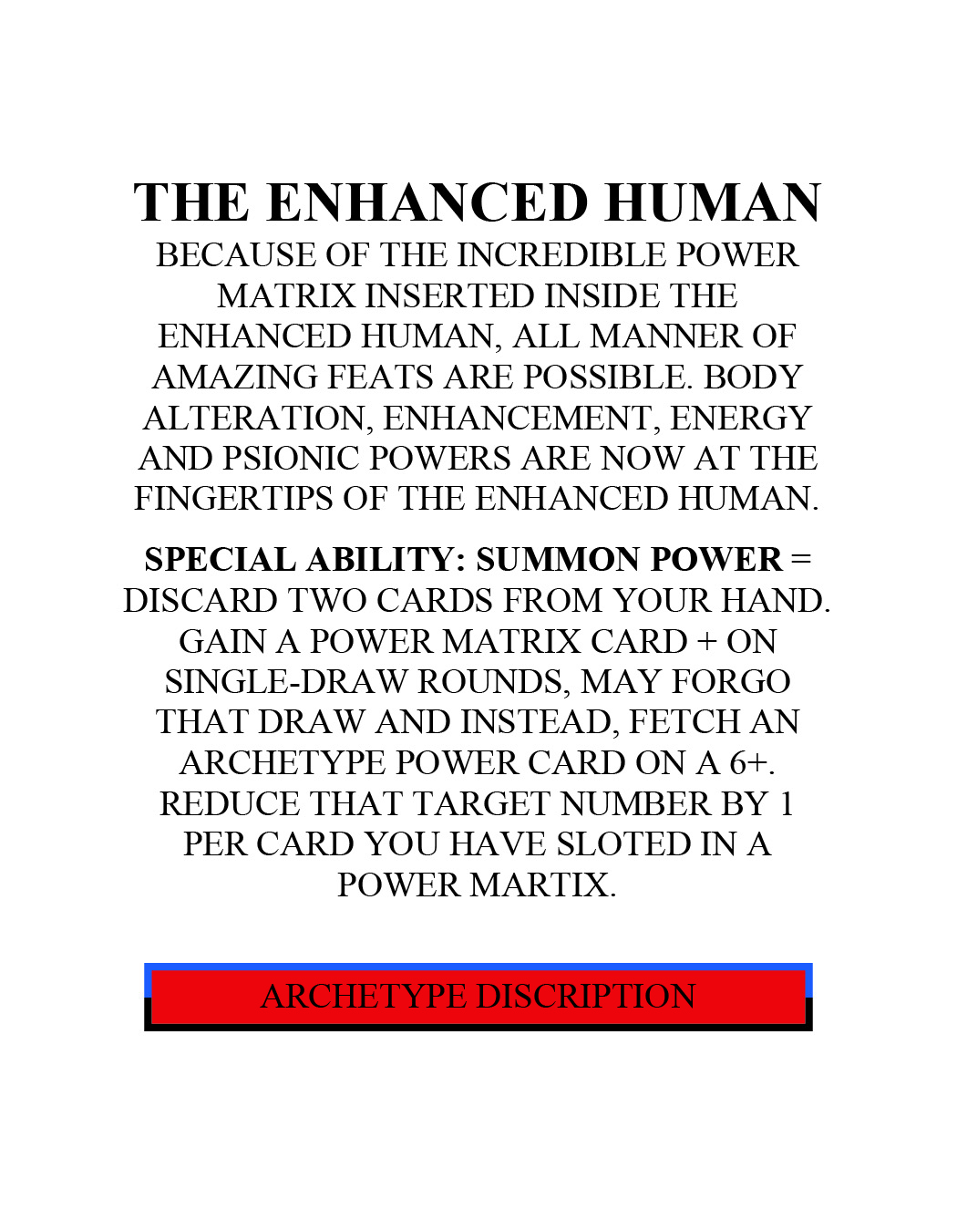 Hey, I’ve got good news for you. All the trouble you were going through to find someone is over. You can rest easy now, I’m here. Allow me to introduce myself, I am the Enhanced Human. I can create, absorb and manipulate energy. Yes, I know but that’s not all, I can also become super-strong or super-fast. Yep, just like the Speedster or the Powerhouse. Oh, I see you’re impressed, I wonder how you will feel when you see me using Psychic powers. Yes, I can do that too. How you ask? With my Power Matrix of course. Sorry friend, I can’t tell you much about it as it is top secret. Just know that it allows me to use all kinds of powers from shooting webs from my wrists and crawling on walls to sprouting wings and flying to growing extra arms to turning into a giant! Plus, you know, all the other stuff I said. Not only that but, most times, I can use the same powers that other folks have, at an even higher level than they can! It’s all thanks to the Power Matrix. So, what do you say? Partner with me and let’s show people just how foolish it is to be your enemy.